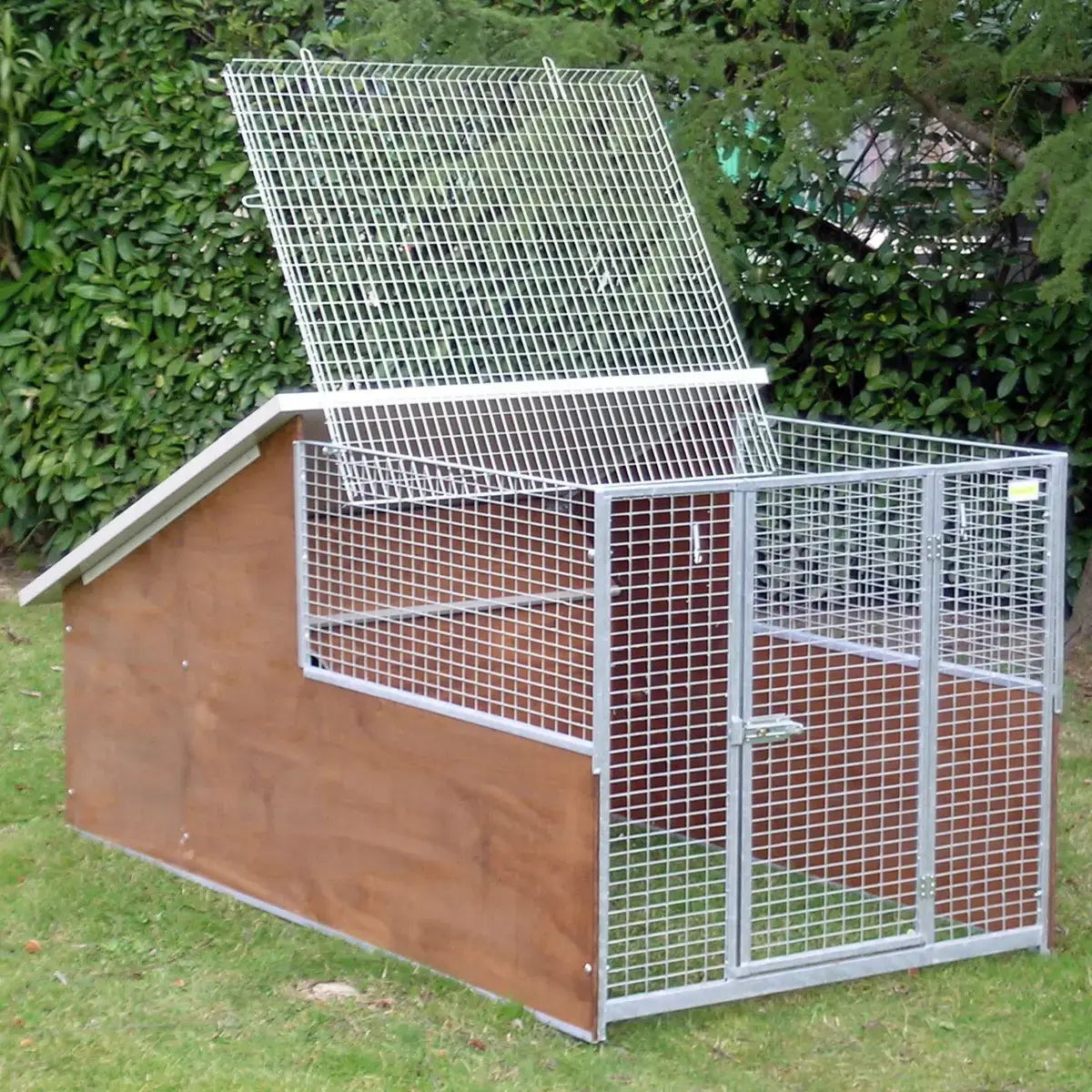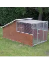 - caseta interior de madera (125 x 65 x 85 h, con entrada "anti-mordeduras" de 27 x 47 h), inspeccionable levantando el techo y equipada con una plataforma de madera elevada del suelo, desmontable y lavable