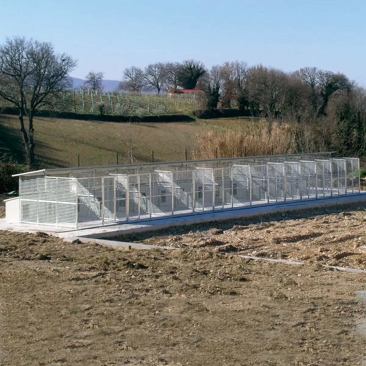 - caseta modelo Dobermann, fabricada en paneles aislantes de 3,5 cm de espesor, enmarcados con perfiles de chapa, fácilmente desinfectables y lavables; completa con techo corredizo y plataforma de madera elevada a 7 cm del suelo, extraíble y lavable