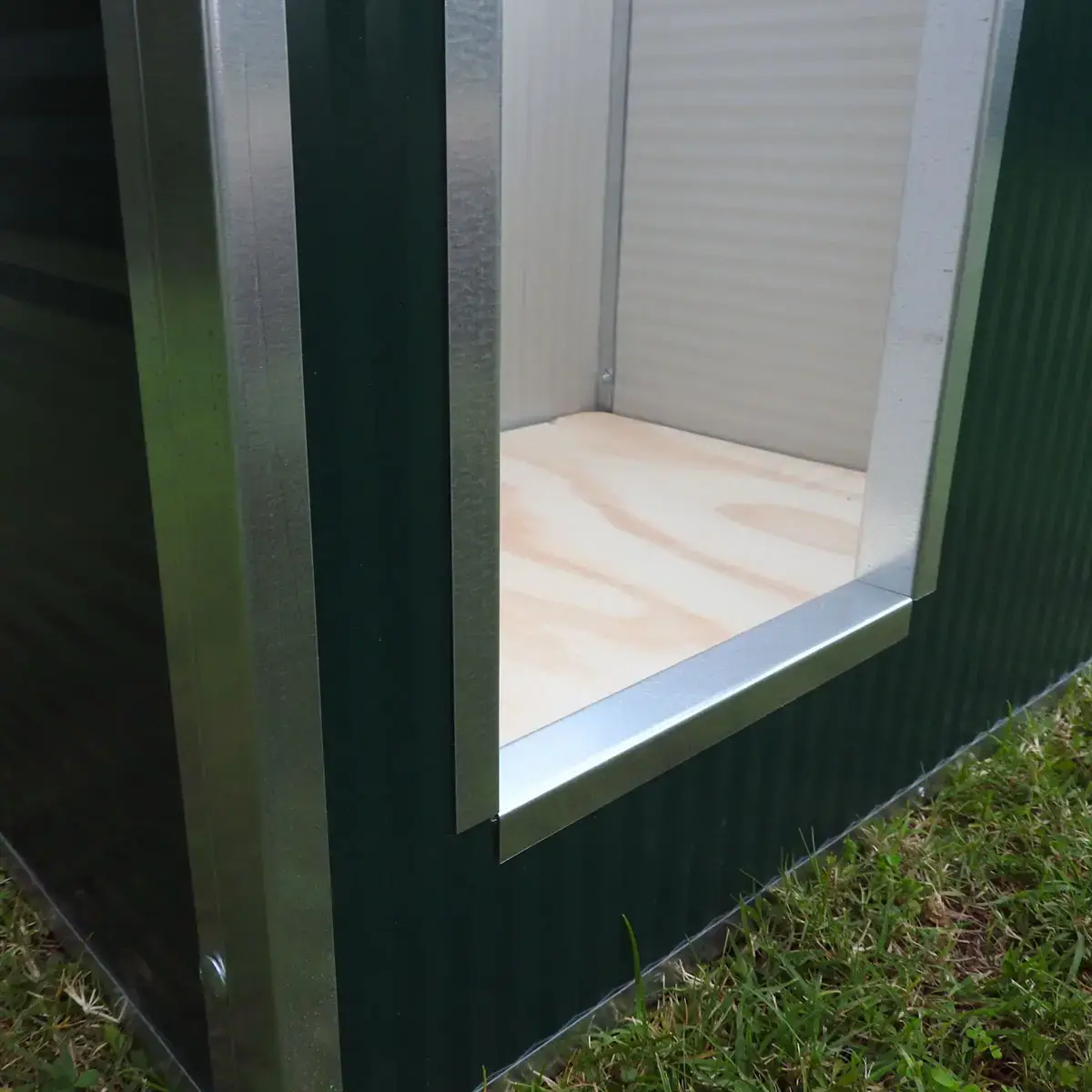 - opción con plataforma de madera con pies de acero, que eleva completamente la caseta (ver accesorios)